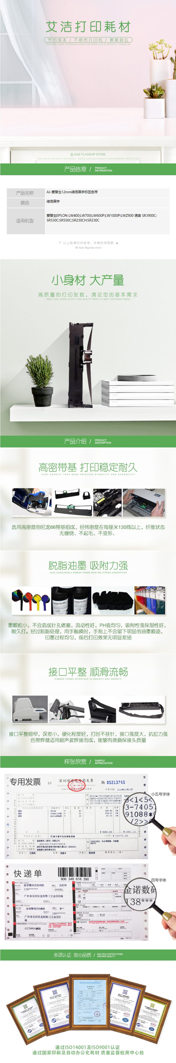 艾洁(AJ) AJ-12mm 标签色带 宽12mm*长8m(单位:个) 适用EPSON LW300/LW400/LW700/LW600P/LW1000P LK-4GBP 绿底黑字