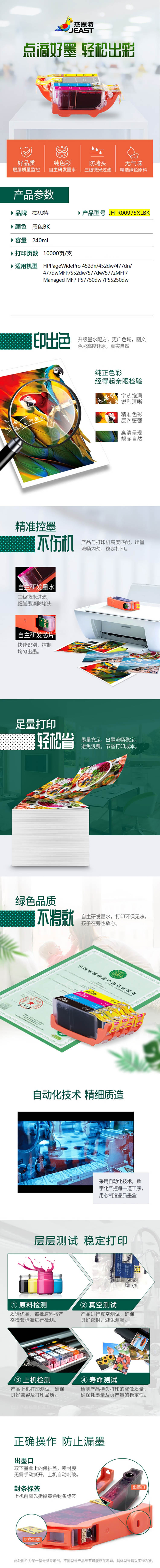 杰思特(JEAST) 975XL墨盒 JH-R00975XLBK 黑色 适用惠普HP页宽打印机 PageWide 352dn 377dn 452dn 477dn 552dw 577z L0S09AA大容量