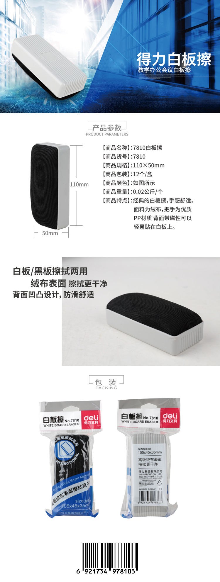 得力(deli) 7810 白板擦 110*50mm(单位:盒) 5个/盒 灰色