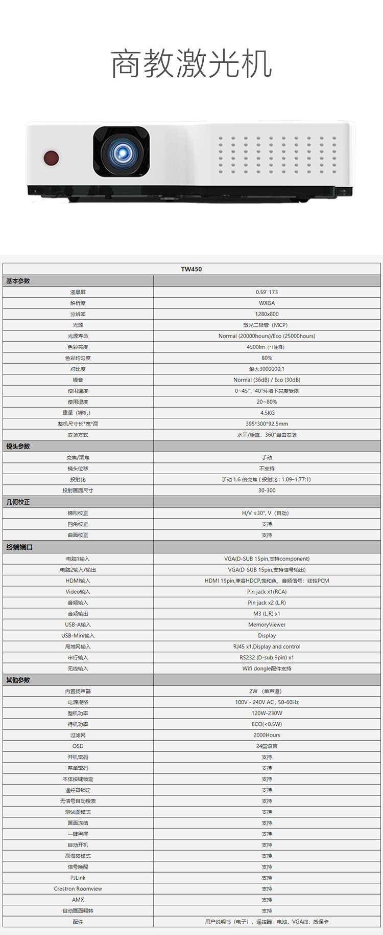 英士 商教激光机 1280×800 4500流明 TW450 WXGA