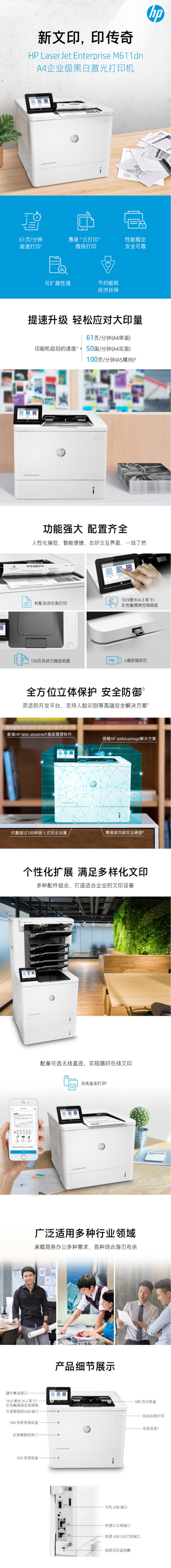 惠普(HP)M611DN 黑白单功能激光打印机 双面打印+有线网络