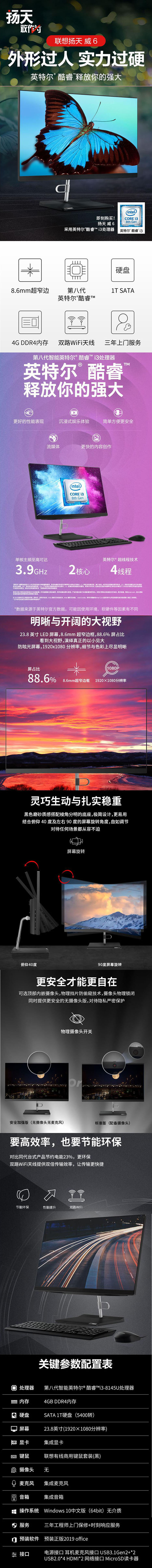 联想 一体机台式电脑 扬天威6 i3-8145U 4G 1T 集成显卡 23.8英寸窄边框 含键鼠 黑色