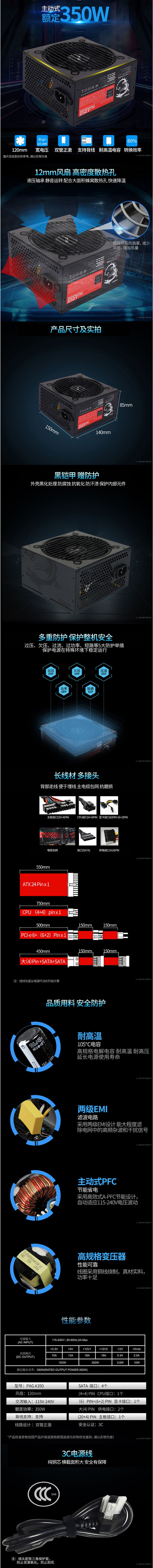 微星MSi PAGA350 台式主机电源 350W 140*150*85mm
