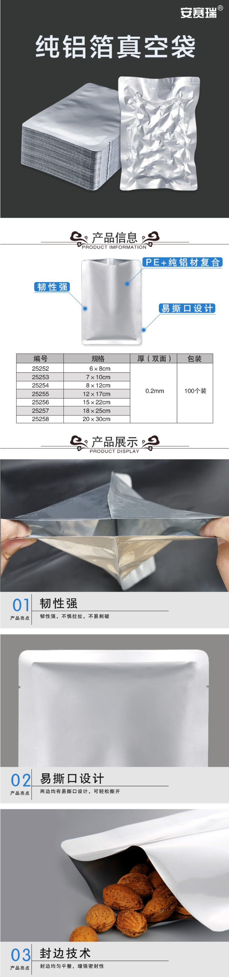 安赛瑞 加厚纯铝箔平口真空袋 6×8cm 25252 100个/包