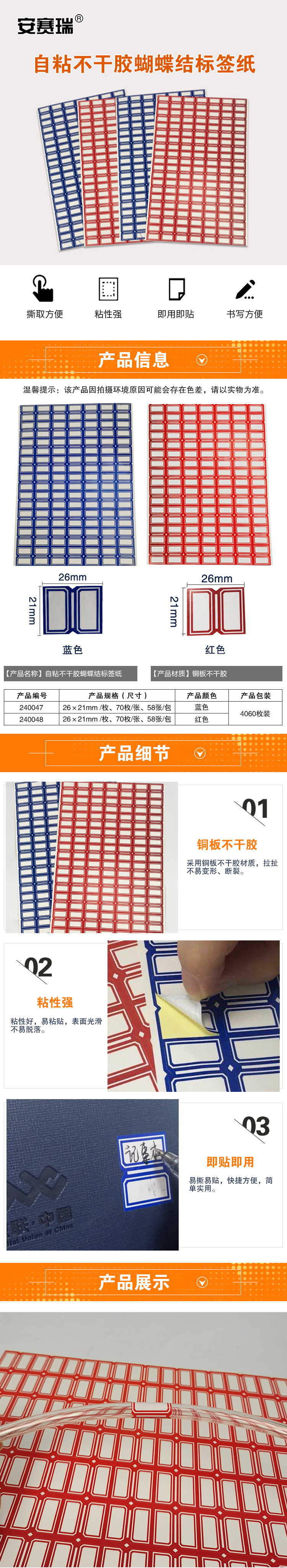 安赛瑞 自粘不干胶蝴蝶结标签纸 240047 26*21mm 70枚/张 58张/包