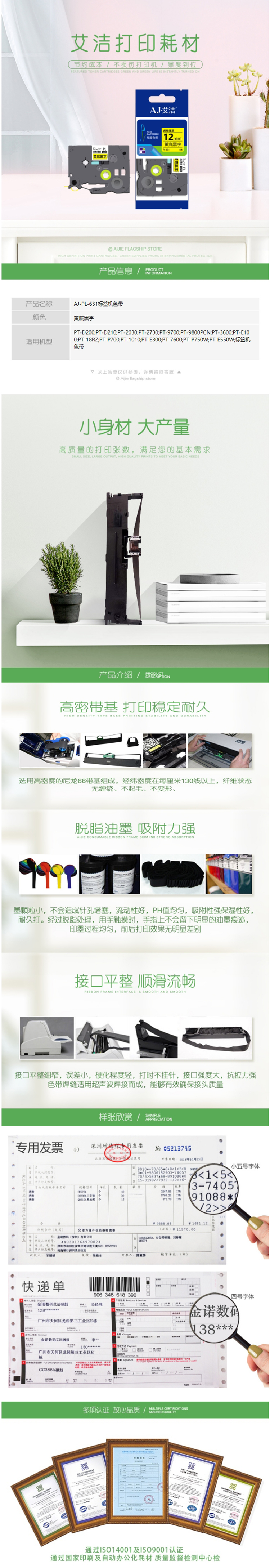 艾洁 AJ-PL-631 标签机色带 黑色 适用兄弟标签机 色带12mm黄底黑字 TZe-631