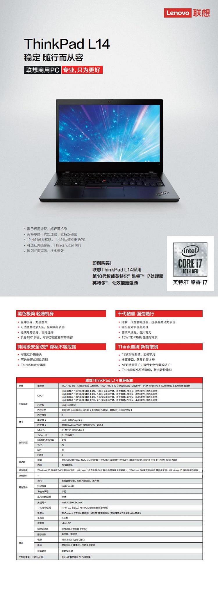 联想(Lenovo) 笔记本 ThinkPad L14 Gen 1-216 i7-10510U/8G/128G固态+1T机械/14英寸 FHD IPS 屏幕/2G独显/无线网卡+BT蓝牙/720P高清摄像头/指纹识别器/windows 10/一年上门(含原装笔记本包和光电鼠标)