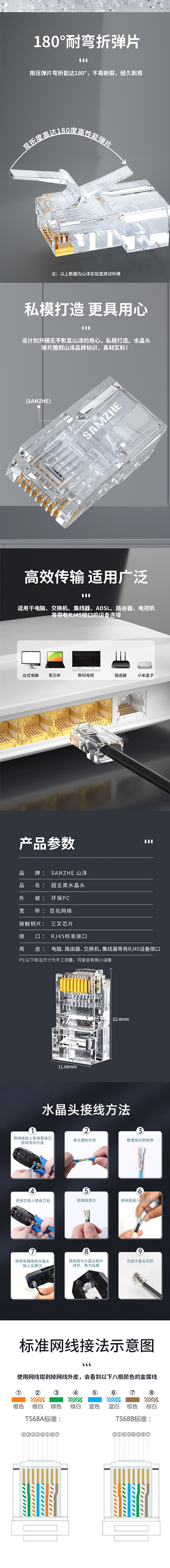产品名称 8P8C超五类网络水晶头 镀金非屏蔽RJ45网线接头CAT5e水晶头