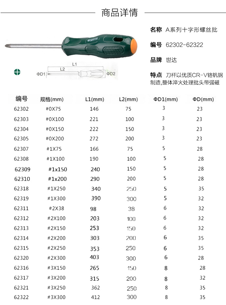世达(SATA) 62317 A系列十字形螺丝批#3x200MM
