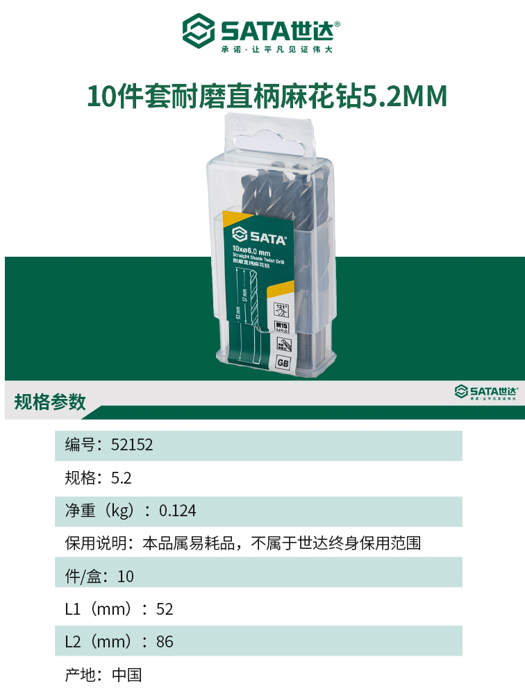 世达(SATA) 52152 10件套耐磨直柄麻花钻5.2MM