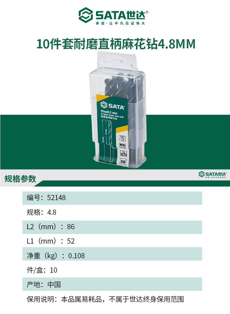 世达(SATA) 52148 10件套耐磨直柄麻花钻4.8MM