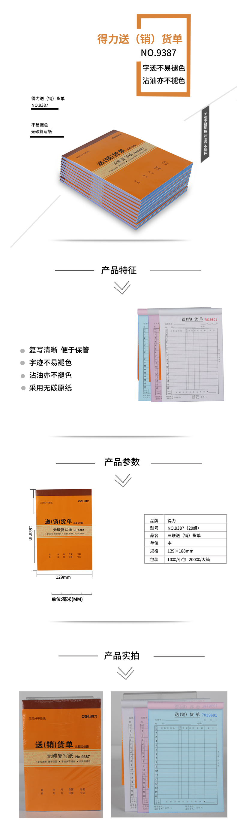 得力(deli) 9387 三联送(销)货单据130*175mm 黄