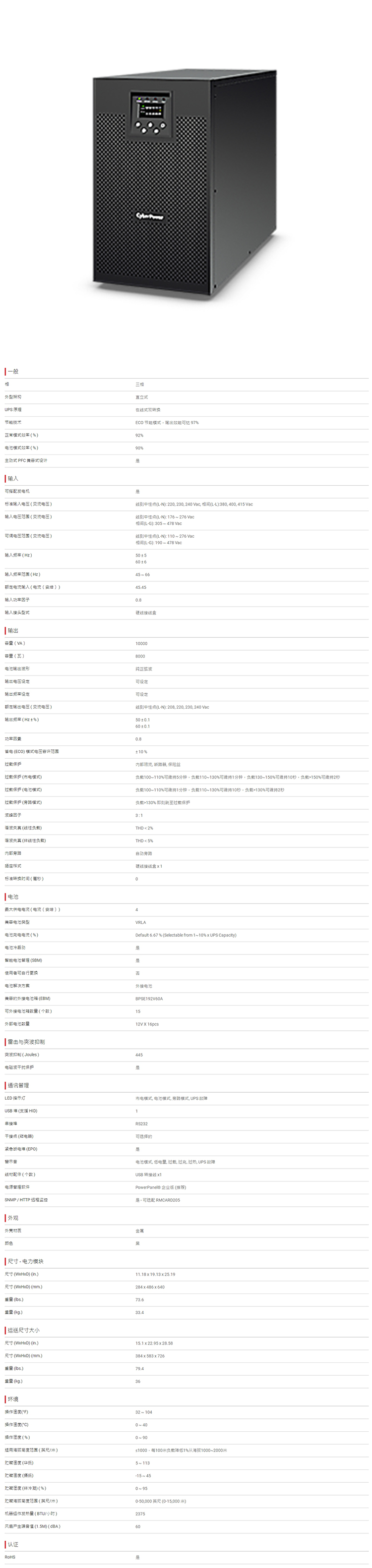 硕天(CyberPower)UPS电源 双变换在线式不间断电源 VA:10000 Watts:8000 OLS3S10KECXL