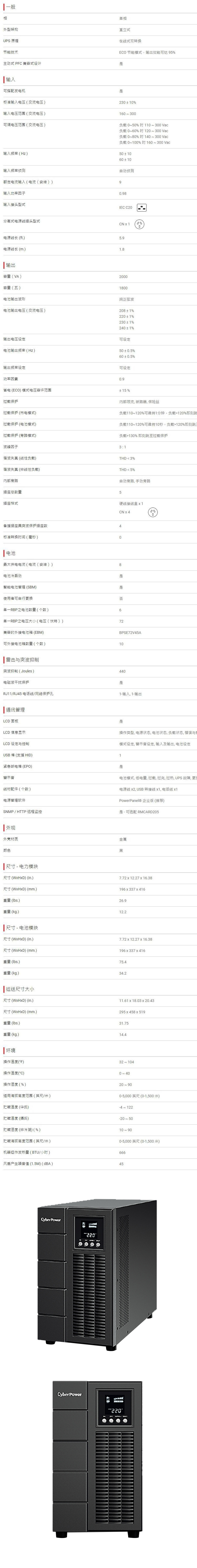 硕天(CyberPower)UPS在线式不间断电源系统 省电 (ECO) 模式 纯正弦波输出 单机头 可搭配电池 OLS2000EXL