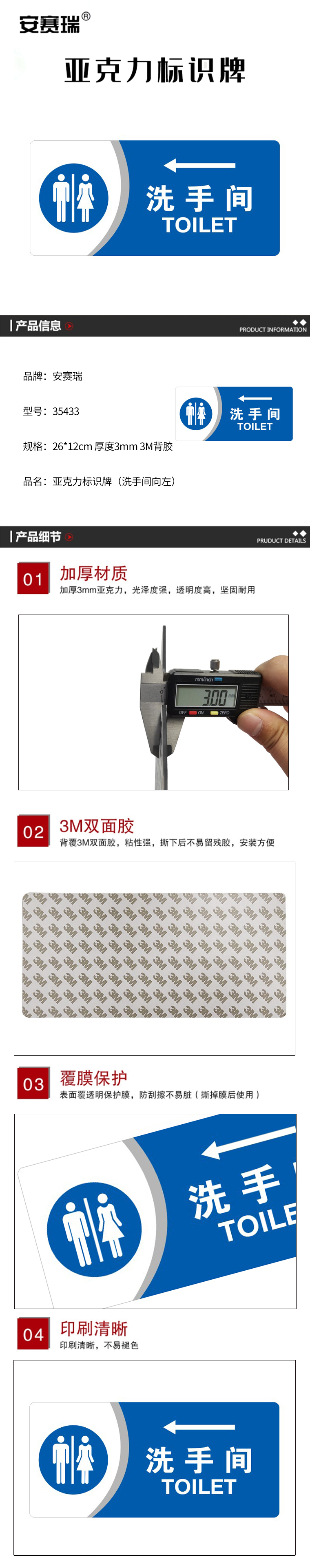 安赛瑞 35433 3M背胶 亚克力标识牌 26*12cm 厚度3mm (单位:张) 洗手间向左