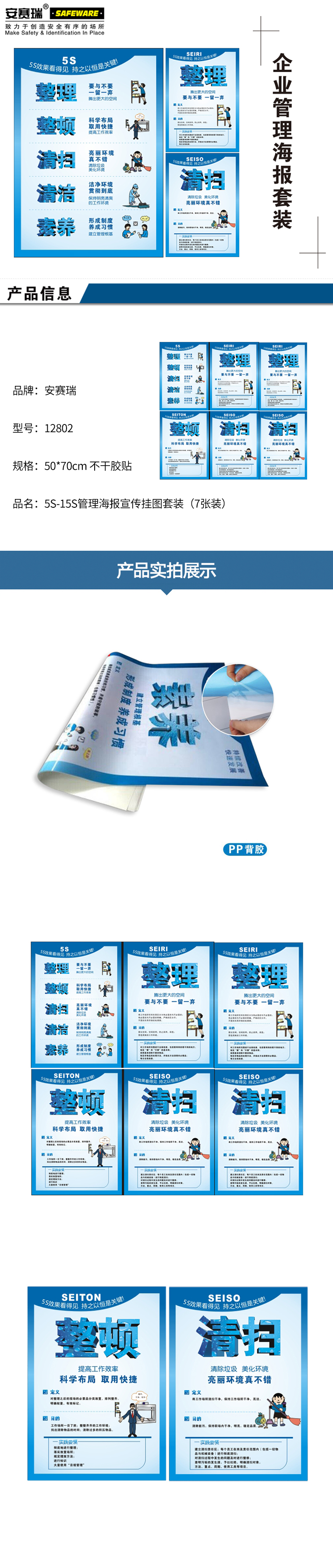 安赛瑞 12802 不干胶贴 5S-15S管理海报宣传挂图套装 50*70cm 7张/套 (单位:套)