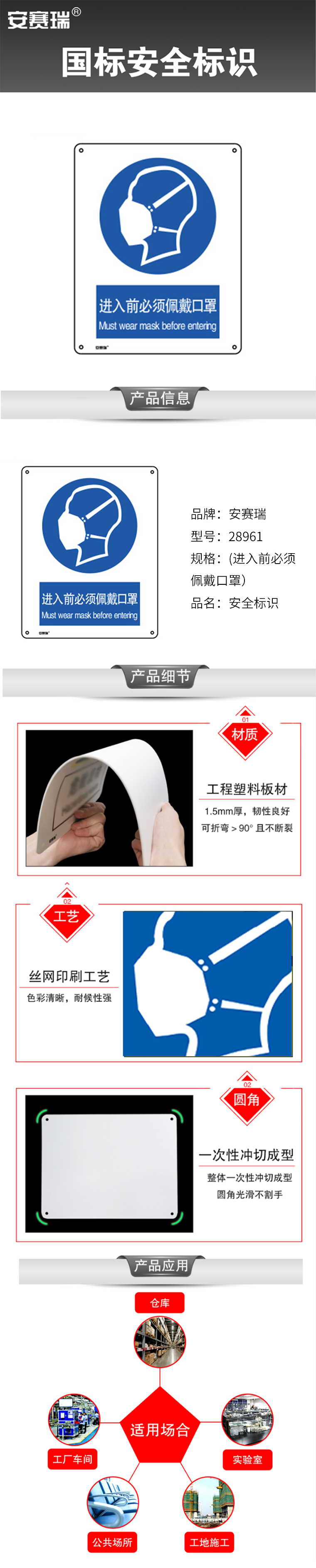 安赛瑞 28961 安全标识 (单位:张) 进入前必须佩戴口罩