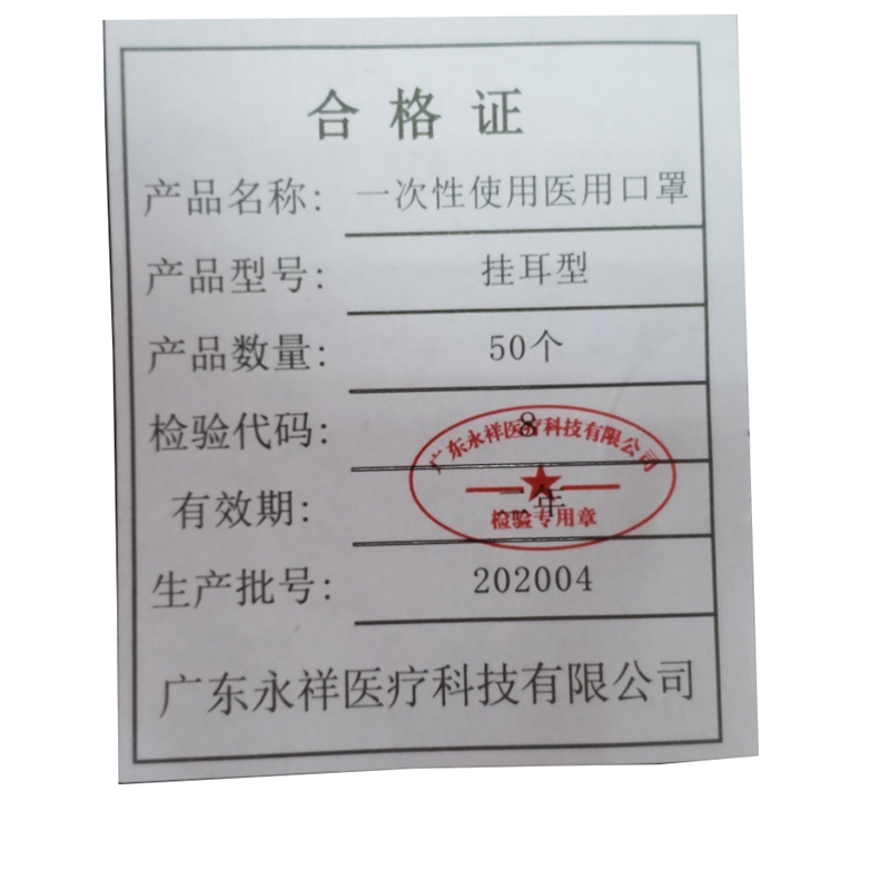 商品名称 永祥医疗 成人一次性医用口罩透气防尘三层防飞沫熔喷无纺布口罩 50只/盒