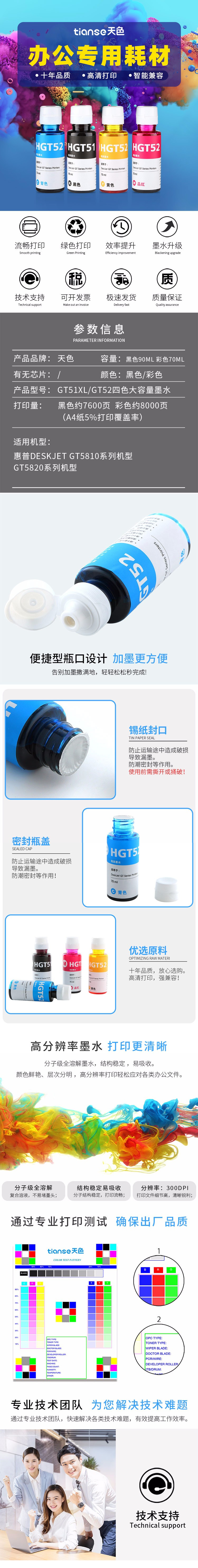 天色 青蓝色墨水 兼容惠普 GT51/GT52 可填充式 适用于佳能墨仓式打印机