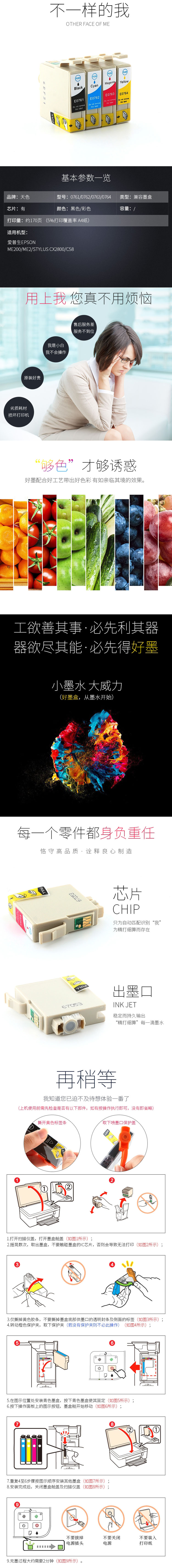 天色 黑色墨盒 兼容爱普生 T0761/2/3/4 适用于Epson me200/me2/styluscx2800/c58