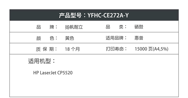扬帆耐立(YFHC) CE272A(650A) 商用版硒鼓 15000页 (单位:个) 适用HP LaserJet CP5520 黄色