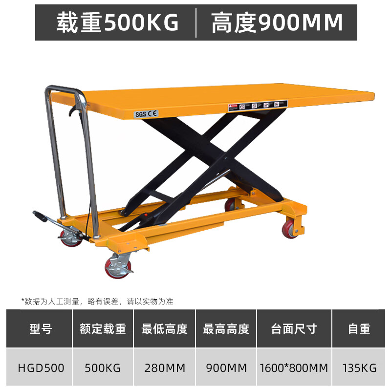 沪工 HGD500 手动液压平台车 500公斤0.9米 台面1600*800 (单位:台)