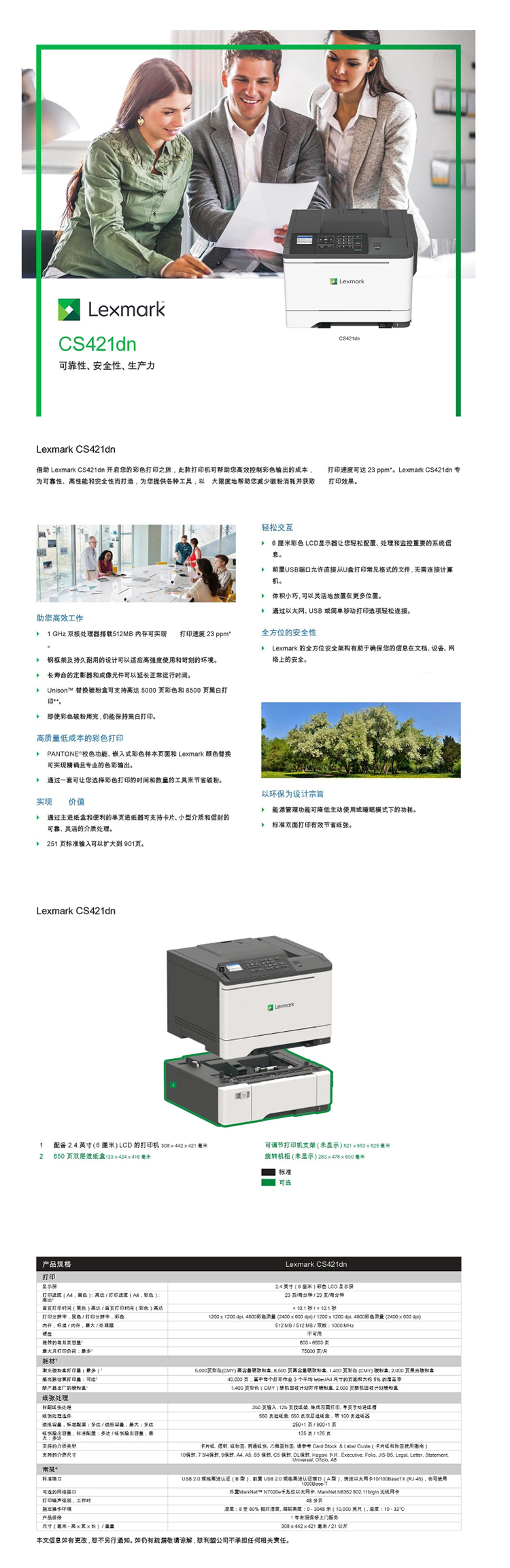 利盟 彩色激光打印机 CS421dn A4双面打印办公商用