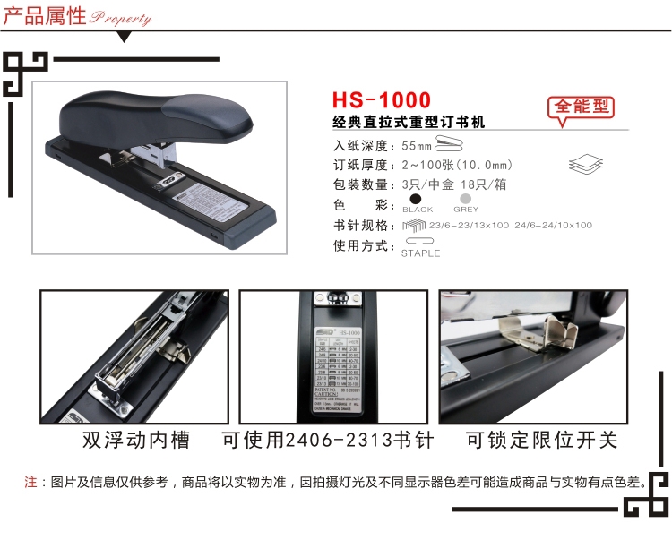 旗文 经典直拉式重型订书机 HS-1000 黑色 订2-100张80克纸 1/3/18