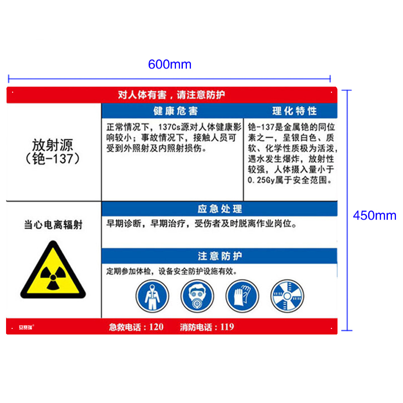 安赛瑞 14627 塑料板 职业病危害告知卡 60*45cm (单位:张) 放射源 铯-137