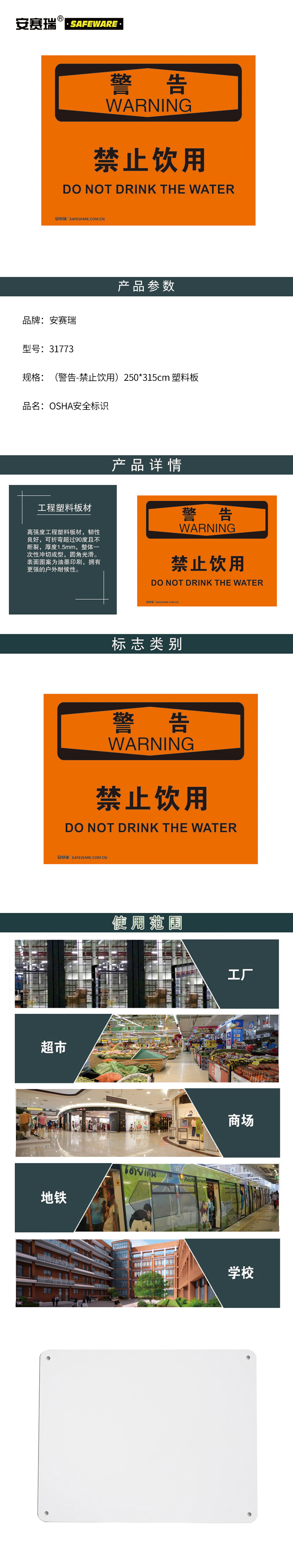 安赛瑞 31773 塑料板 OSHA安全标识 250*315cm (单位:张) 警告-禁止饮用