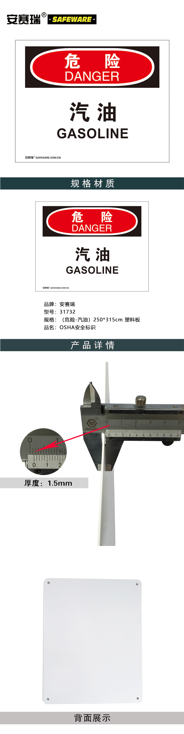 安赛瑞 31732 塑料板 OSHA安全标识 250*315cm (单位:张) 危险-汽油