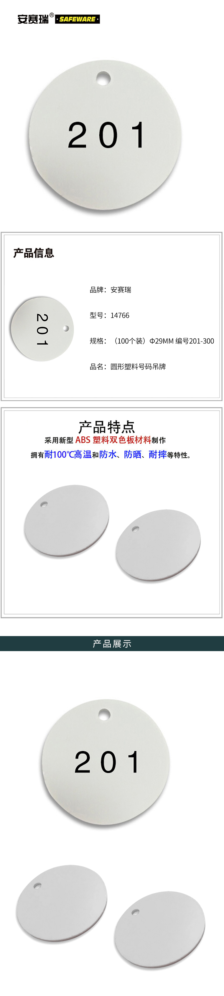 安赛瑞 14766 圆形塑料号码吊牌 Φ29mm 100个/包 (单位:包) 编号201-300 白黑