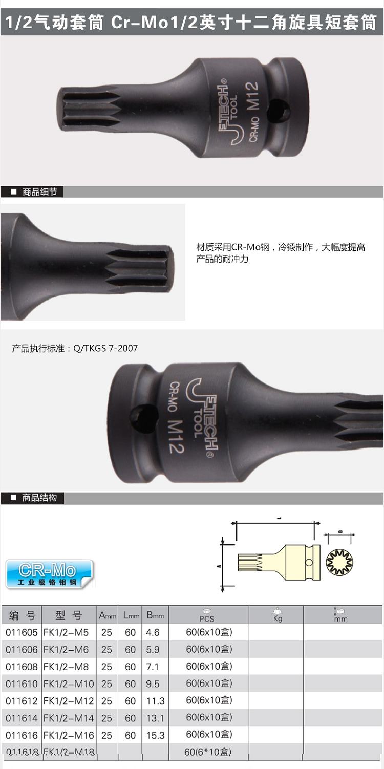 捷科(JETECH) FK1/2-M14 1/2"系列风动十二角旋具短套筒(单位:个)