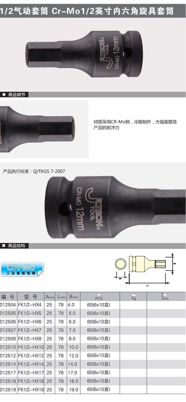 捷科(JETECH) FK1/2-HX12 1/2"系列风动内六角旋具套筒(单位:个)