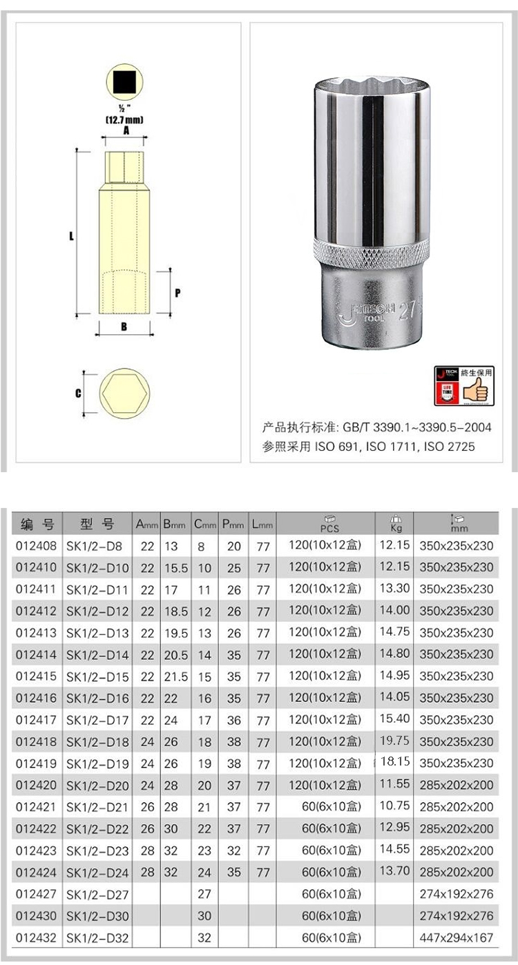 捷科(JETECH) SK1/2-D22 1/2"系列六角公制长套筒22mm(单位:个)
