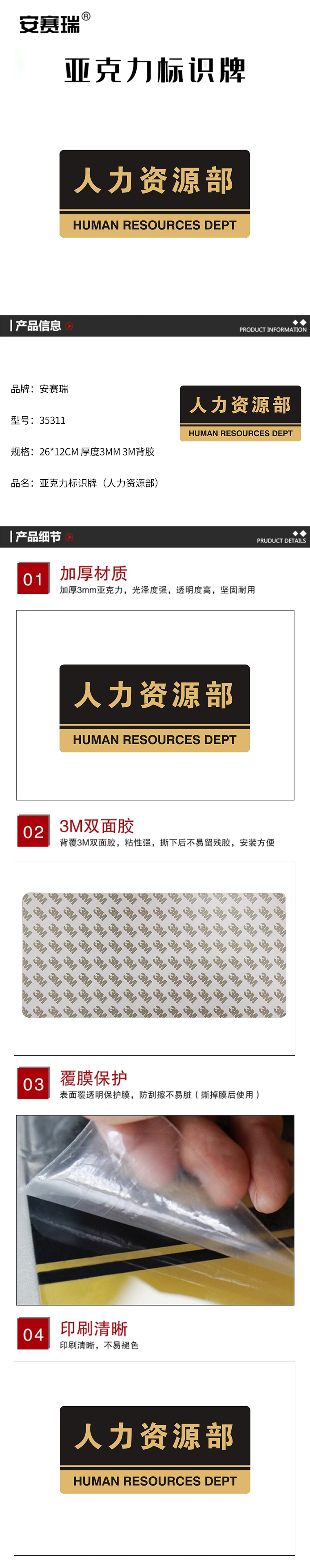 安赛瑞 35311 3M背胶 亚克力标识牌 26*12cm 厚度3mm (单位:张) 人力资源部