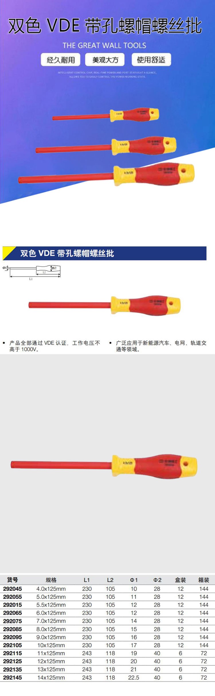 长城(THE GREAT WALL) 292045 双色VDE带孔螺帽螺丝批 4.0*125mm(单位:个)