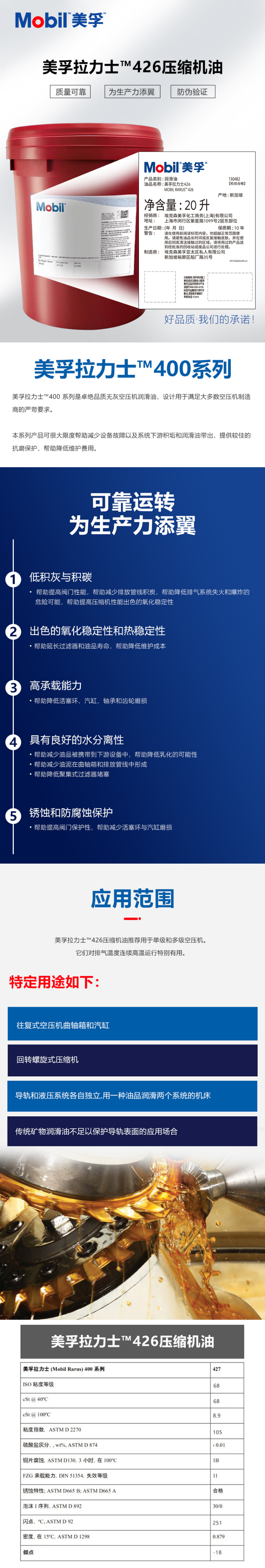 美孚(Mobil) 426 拉力士无灰空压机润滑油 20L(单位:桶)