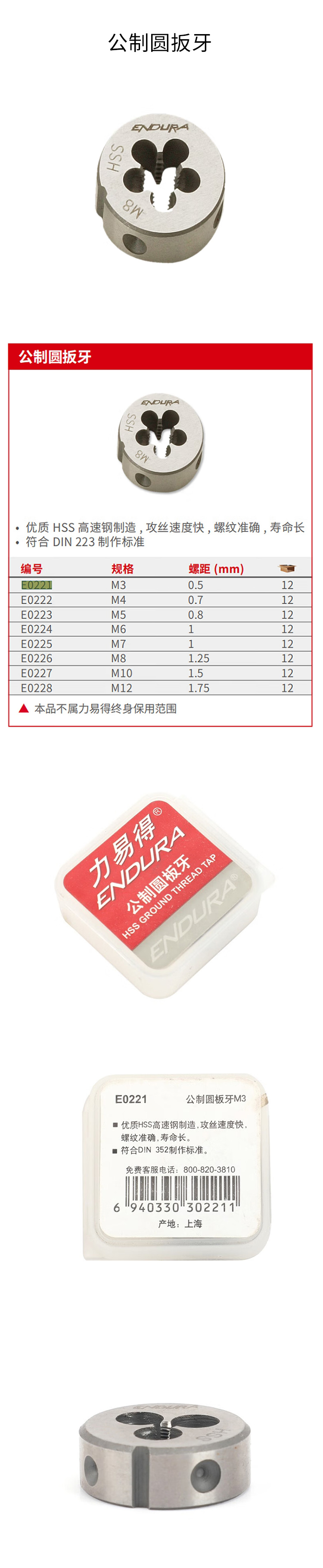 力易得(ENDURA) E0226 公制圆扳牙 M8 1.25mm(单位:个)