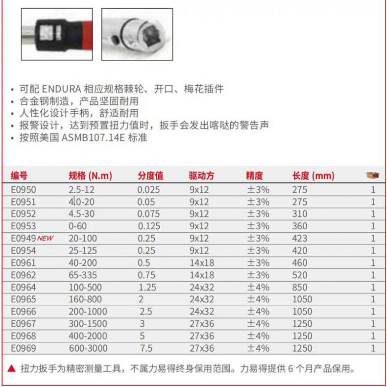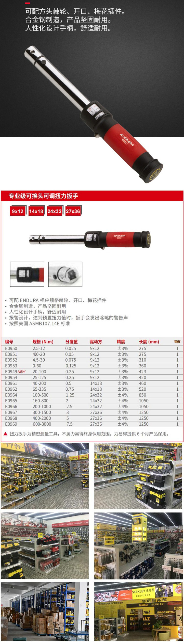 力易得(ENDURA) E0949 专业级9*12mm可换头可调扭力扳手 20-100N.m(单位:把)