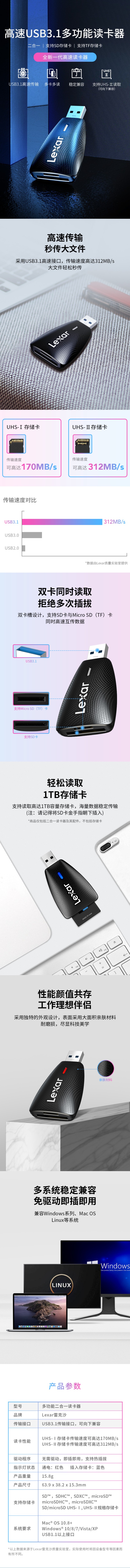 雷克沙(Lexar) LRW470U-RNHNC 高速SD/TF卡读卡器 3.0 type-c转接头(单位:个)