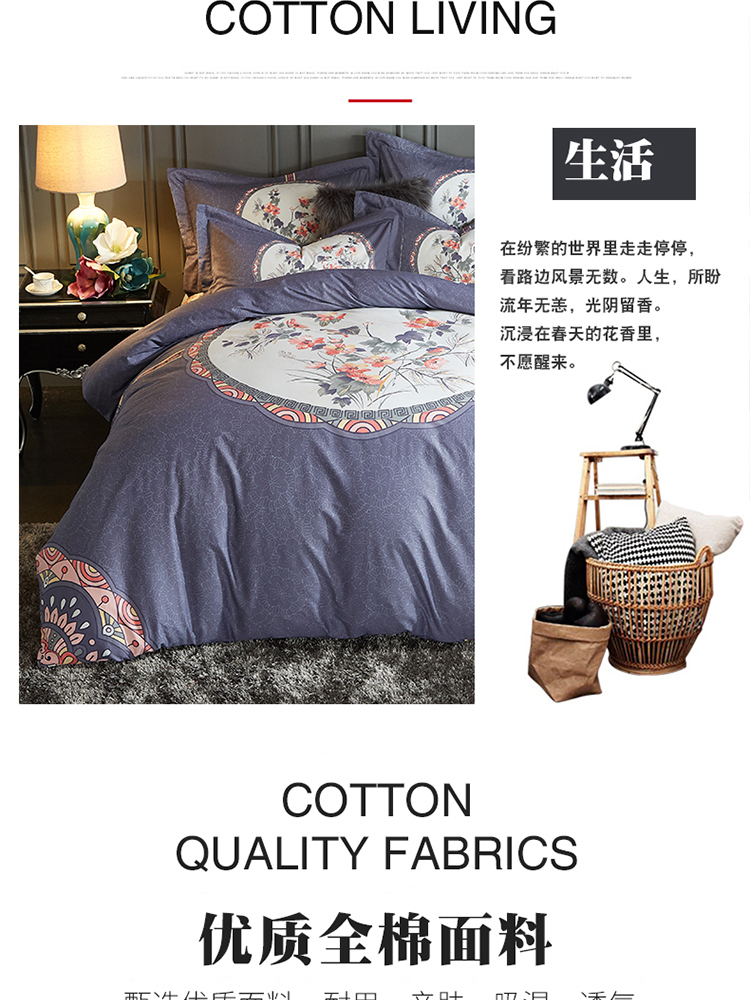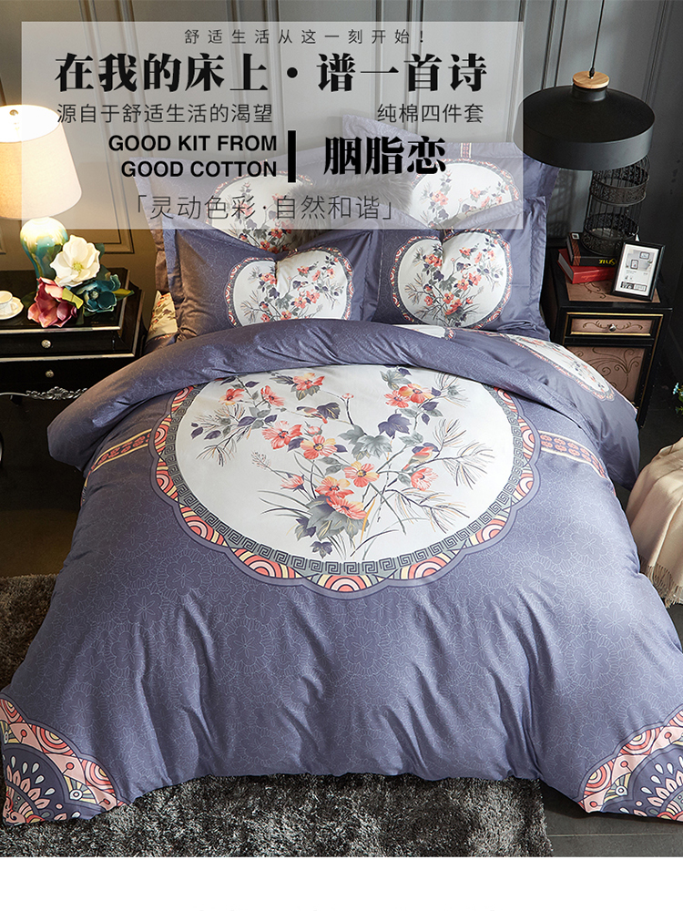 花雨伞 胭脂富华四件套 蓝色 被子 被单 床上用品 家纺 床单