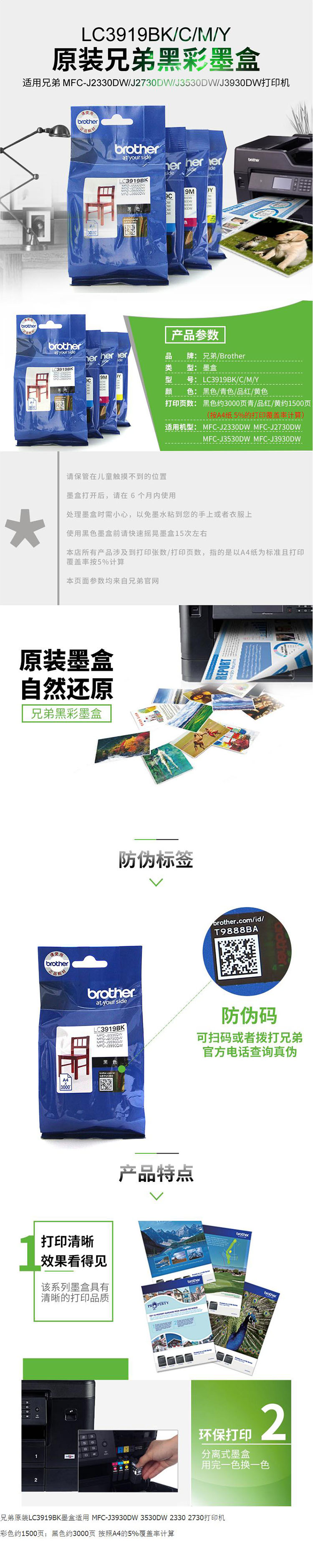 兄弟(brother) 打印机墨盒 LC3919BK 黑色 3000页 适用于J3930DW/J3530DW/J2730DW/J2330DW