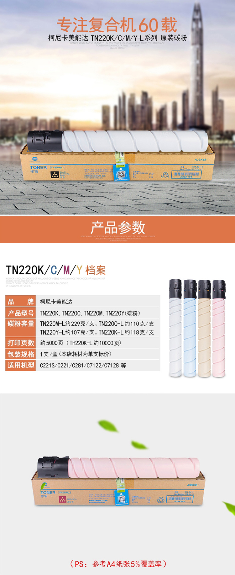 柯尼卡美能达复印机粉盒TN220M-L小容量 A4纸5%覆盖打印5000张 适用于C221S C221 C281 红色