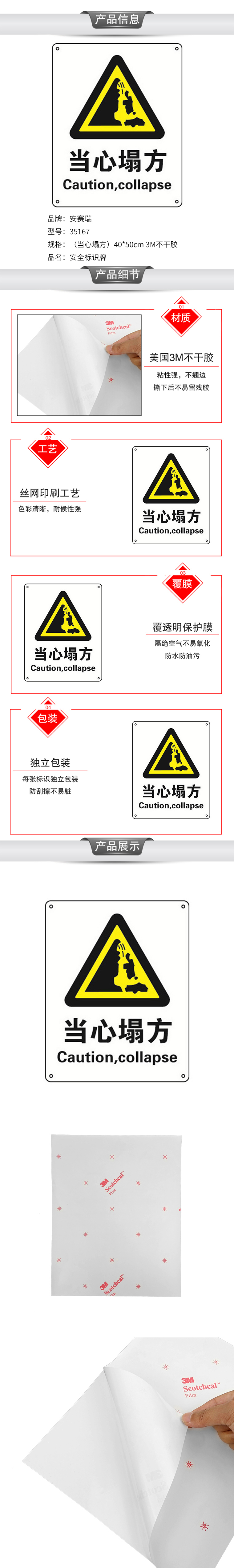 安赛瑞 35167 3M不干胶安全标识牌 当心塌方 40*50cm (单位:张)