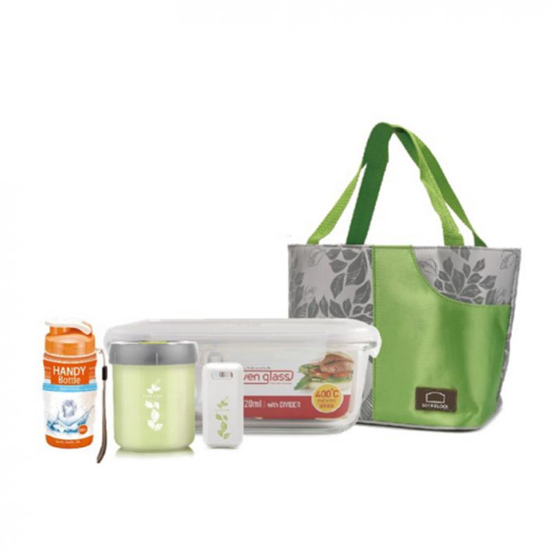产品清单 拎袋+长方形分隔玻璃保鲜盒1020ml+彩色运动水杯+汤桶+餐具组A