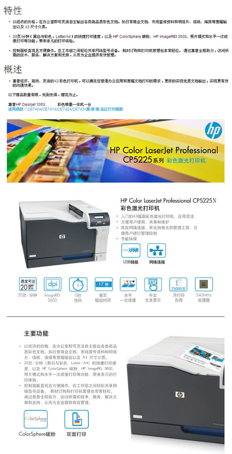 惠普彩色激光打印机HP Color LaserJet CP5225n