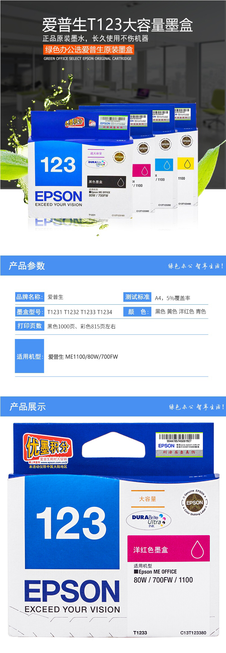爱普生打印机墨盒 T1233 适用于700FW/80W 洋红