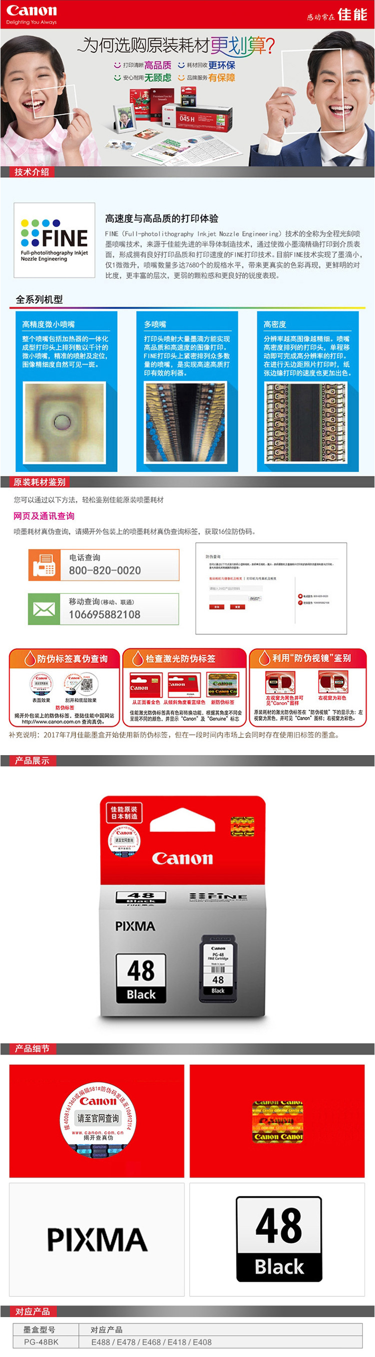 佳能 PG-48 黑色墨盒 (适用E488、E478、E468、E418)