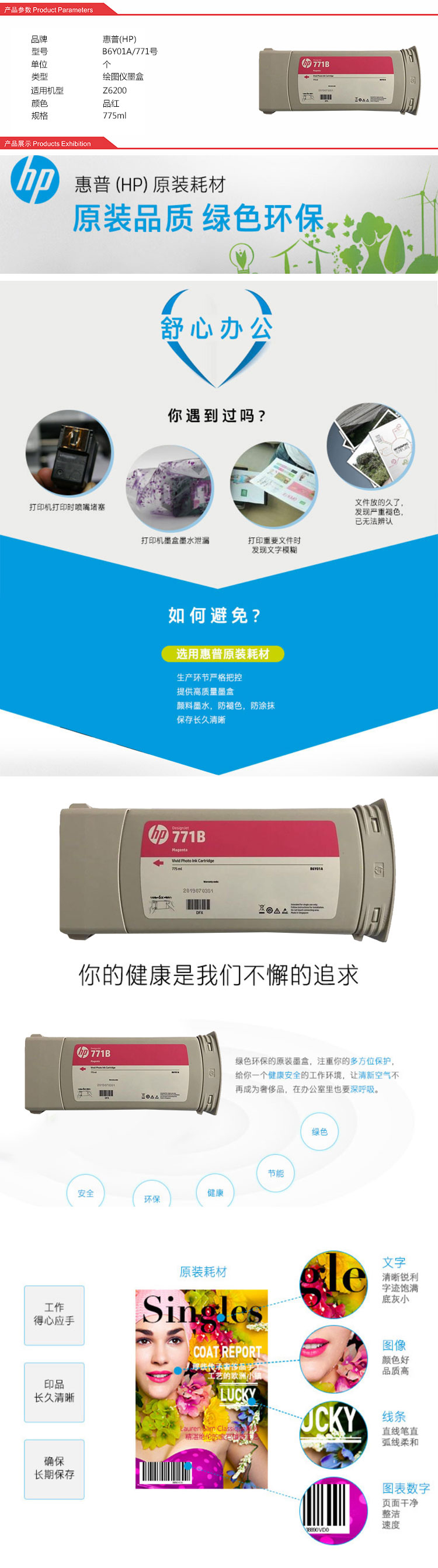 惠普 B6Y01A 771B 墨盒(单位:个) 适用于:Z6200 品红